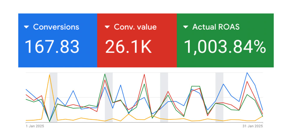 We helped this caffeine supplements brand generate 167 sales with a total conversion value of $26.1K, achieving a ROAS of 1,003%. Through refined audience targeting, optimised product ads, and smarter campaign structure, we drove steady sales growth while maintaining strong efficiency.