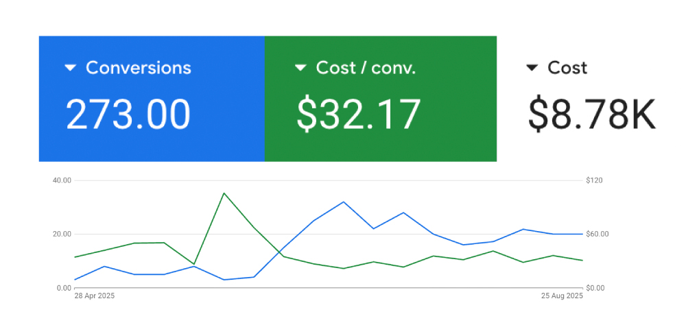 We helped generate 273 conversions with a total ad spend of $8.78K, bringing the average cost per lead down to just $32.17. By refining location targeting, optimising ad copy, and improving bidding strategies, we delivered a steady flow of qualified enquiries at an efficient cost.