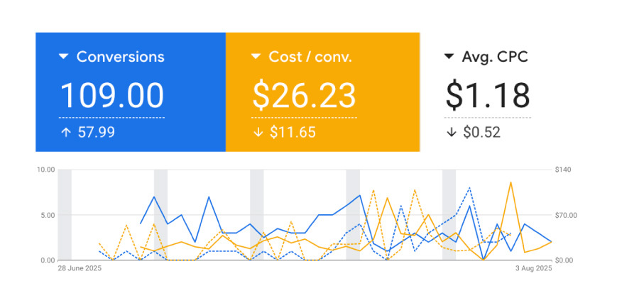 This client saw enquiry volume surge to 109 conversions. Average CPC also fell to $1.18, improving overall efficiency and lead quality.